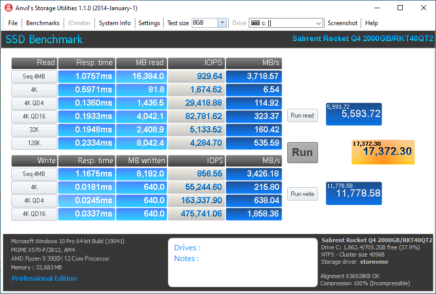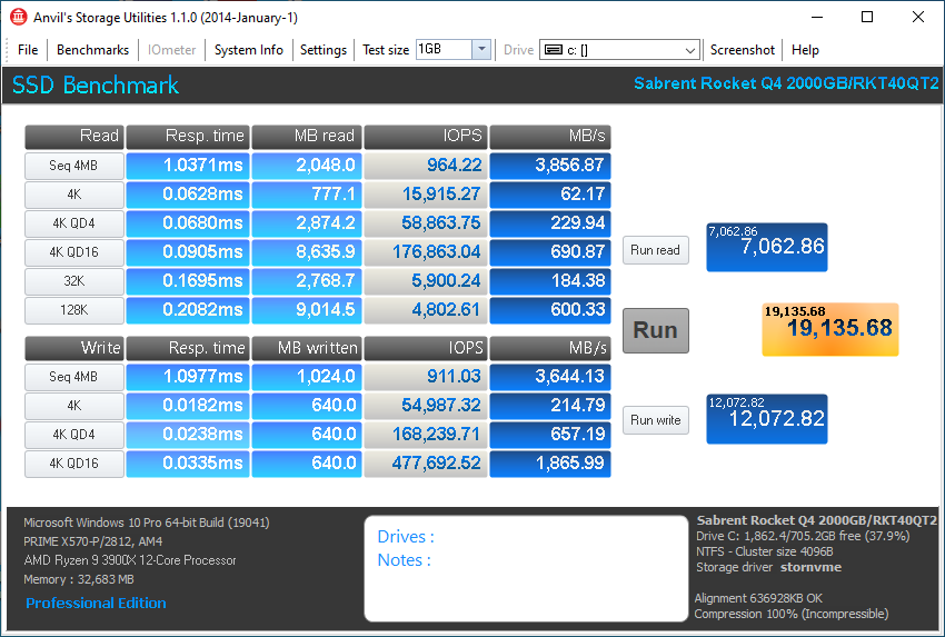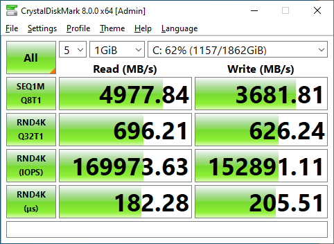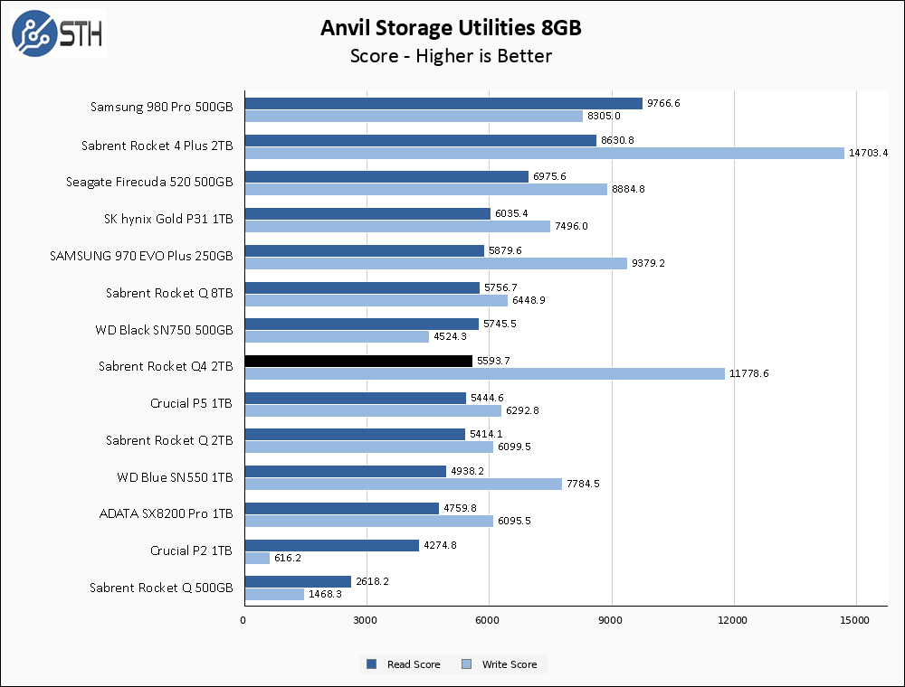 Were it not for the recently reviewed Samsung 980 Pro and Sabrent Rocket 4 Plus, the Rocket Q4 2TB would be taking the top spot for both read and write score in Anvil. Even in the context of those two drives, the Rocket Q4 is a strong performer, and Phison-based drives always do well in Anvil’s write tests in particular.