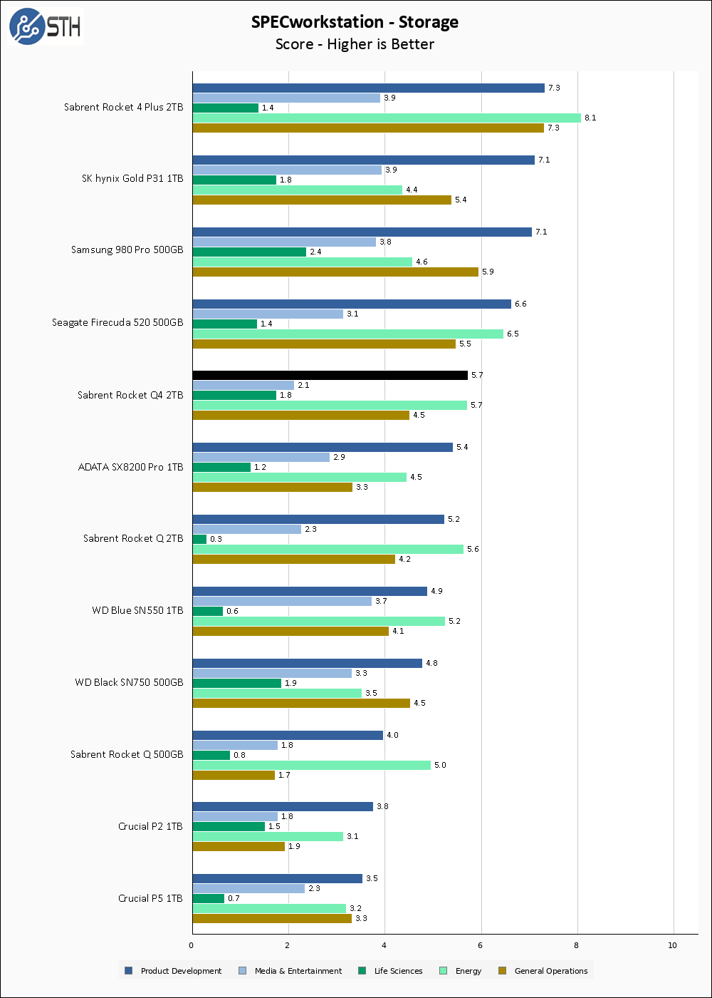 Performance in SPECworkstation Storage is good overall, though the Rocket Q4 2TB does not win overall in any of the subtests.