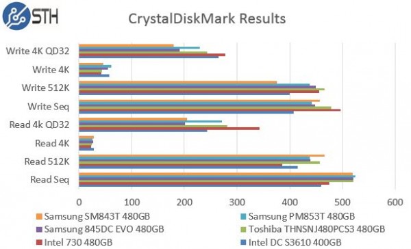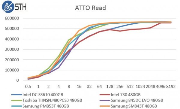We probably could have done an all-Samsung review but we instead opted to add both drives from Intel, including the new Intel D S3610 and a Toshiba SSD. As one can see all five SSDs are relatively close in performance. The high queue depth writes favor non Samsung drives. We also see some excellent sequential write gains over the SM843T which is a MLC drive.