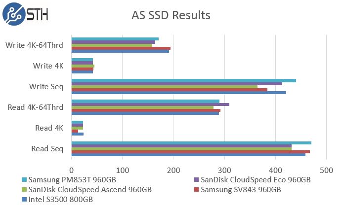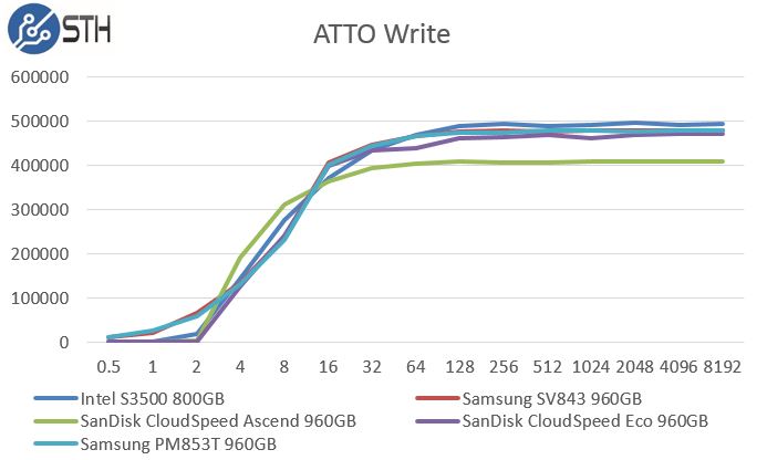 The write story does not show those same blips. Instead, we can see that the performance of the PM853T 960GB is much closer to what we would expect and outperforms the SanDisk CloudSpeed Ascend at small and large transfer sizes.