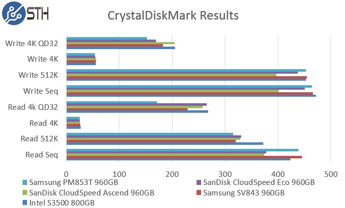 On CrystalDiskMark we can see that the QD32 read and write results are not the sweet spot for the PM853T. All other SSDs in the comparison group provide better performance. When it comes to sequential reads and writes, the Samsung PM853T 960GB fares better.