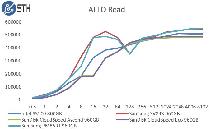 On the ATTO read benchmark side we see something extremely similar to what our Samsung SV843 960GB benchmark result showed which is a read hole around the 128k transfer size. One can see the performance is generally good, however there is a blip that we have seen on another Samsung drive.