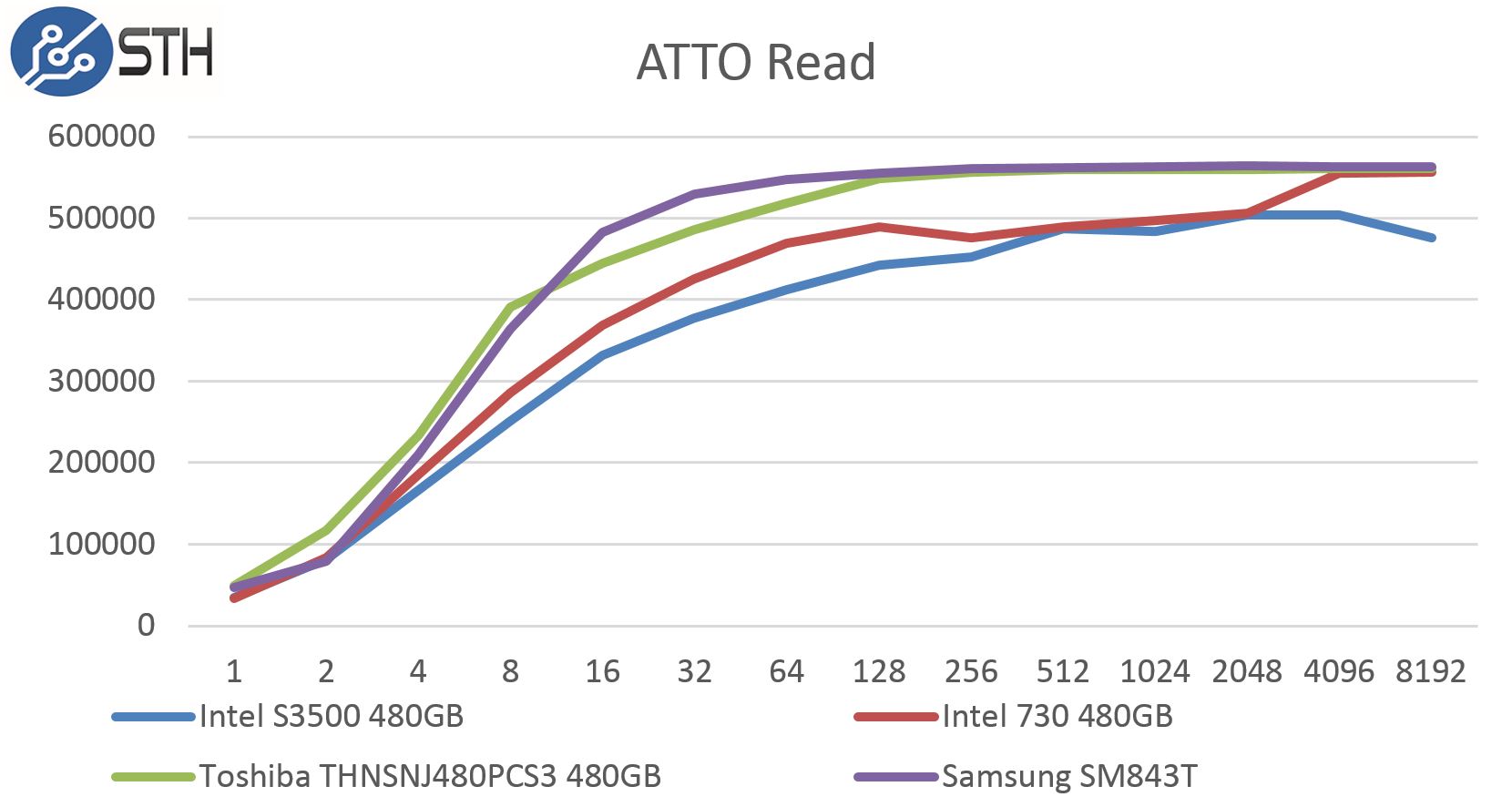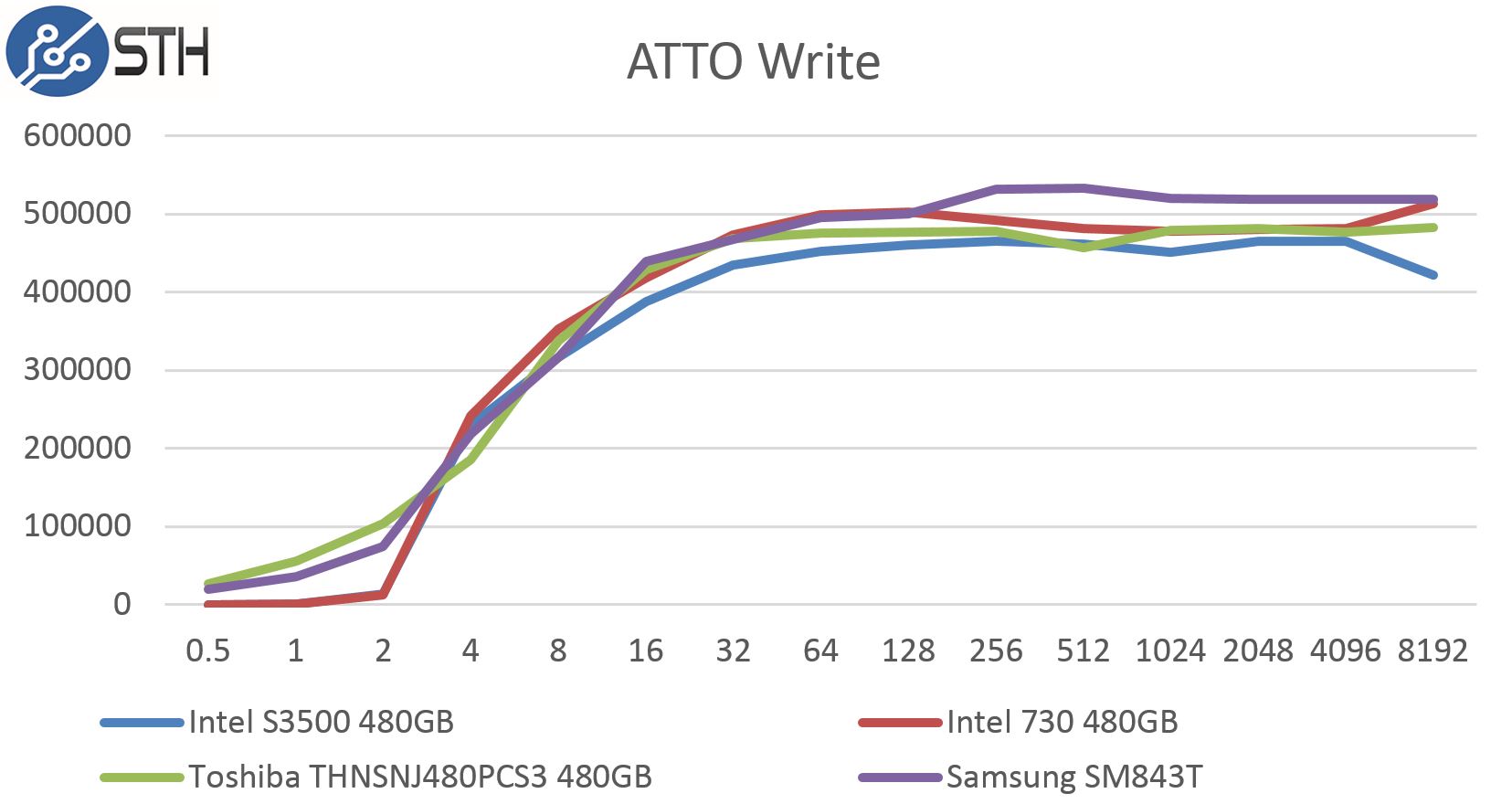 On the ATTO read side, we see the Samsung SM843T perform extremely well. Starting around the 16k sizes the SM843T is topping charts.