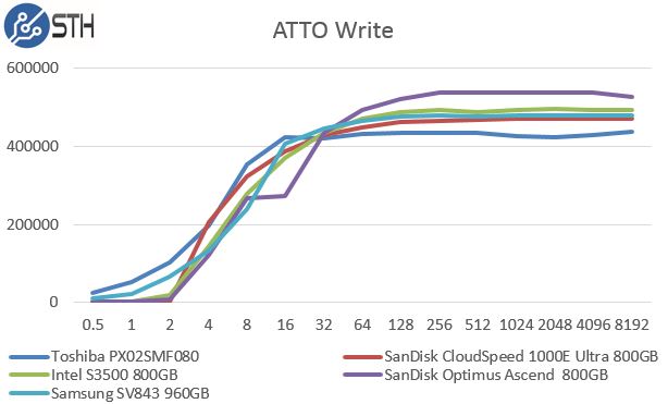 This is an extremely interesting graph. We see the Samsung SV843 960GB drives perform very well at small transfer sizes but there is a bit of a dip on the 64k size. We tried in two different systems and then on the Intel controller. This blip happened on the LSI/ Avago controllers but not on Intel controllers. We do know that many SATA disks behave slightly differently on SAS controllers so this is an example.