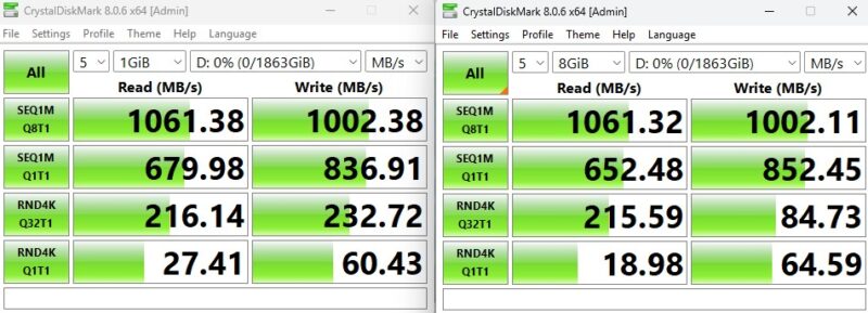 CrystalDiskMark is used as a basic starting point for benchmarks as it is something commonly run by end-users as a sanity check. We use both 1GB and 8GB test sizes.