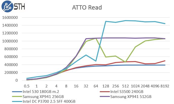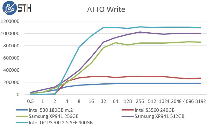 We added in the Intel DC P3700 400GB 2.5″ SSD. It draws more power (up to 25w), costs significantly more, but it also shows solid performance in terms of a NVMe SSD. One can see that compared to the Intel 530 180GB m.2 SSD and the Intel DC S3500, the XP941 256GB drive performs extremely well. The larger 512GB XP941 does show some significant performance benefits too.