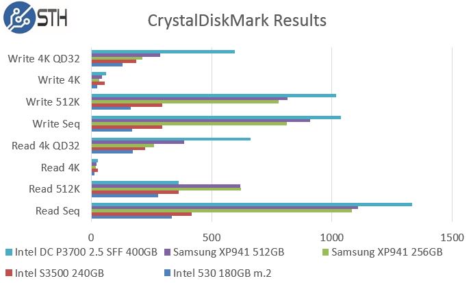 In the CrystalDiskMark results we do see an aberration where the Intel DC P3700 falls behind the Samsung XP941’s on the 512K read test. On the other hand, we do see performance generally in-line with what we would expect. One major note here is that if one has the opportunity to purchase the 512GB model, performance is significantly better.