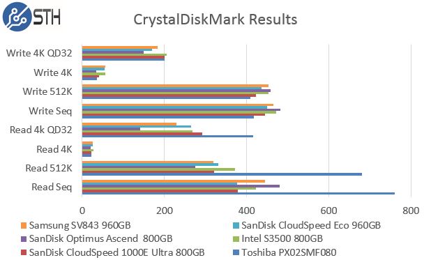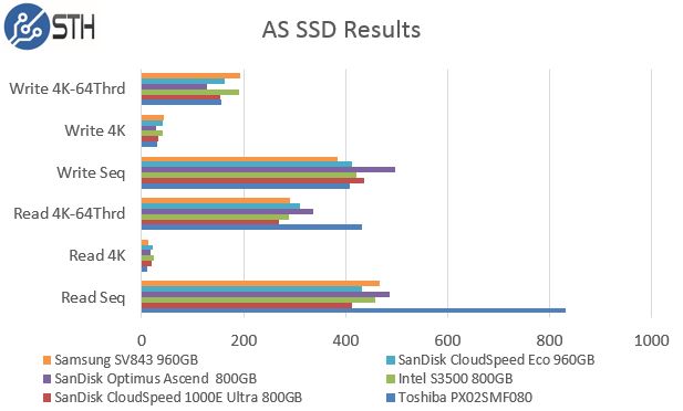 Our CrystalDiskMark results highlight how competitive the market is. We can see the CloudSpeed Eco 960GB drive perform well against many competitors on both the SATA and SAS sides. Particularly interesting is that it outperforms the Samsung SV843 in a number of tests.