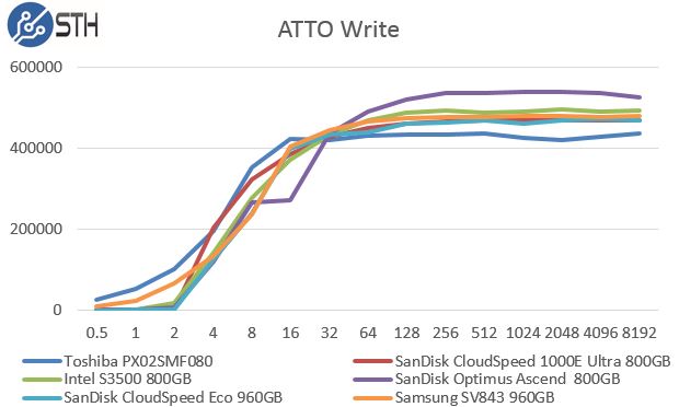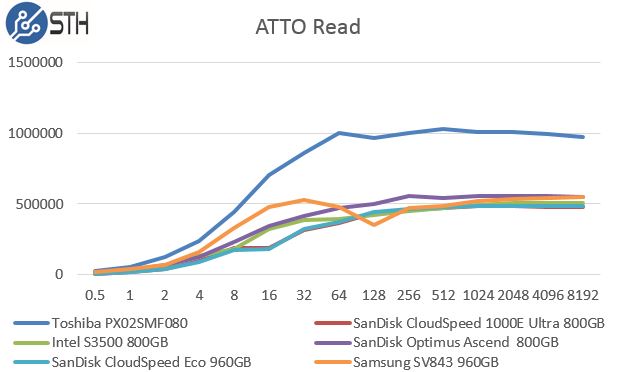 On the read performance side, we can see that the SanDisk CloudSpeed Eco 960GB tracks well to the 1000E we looked at previously. The drives are not the fastest but this is a very tough competitive roundup.
