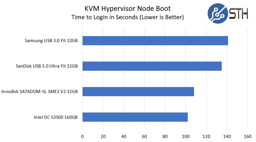 We decided to setup a test image based on Centos 7.3 to serve as a KVM hypervisor. We timed from when the server started booting to when we hit the CentOS logon prompt. That should be a good proxy for performance whether you are using VMware ESXi, RedHat Enterprise Linux, Ubuntu, Debian, Microsoft Hyper-V Server, Microsoft Windows Server or other OSes. While the boot times may differ in their values, the tasks are largely the same so relative performance is what we are looking to gauge.