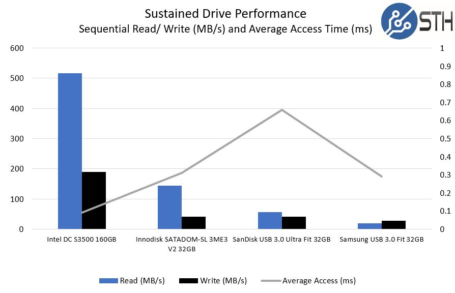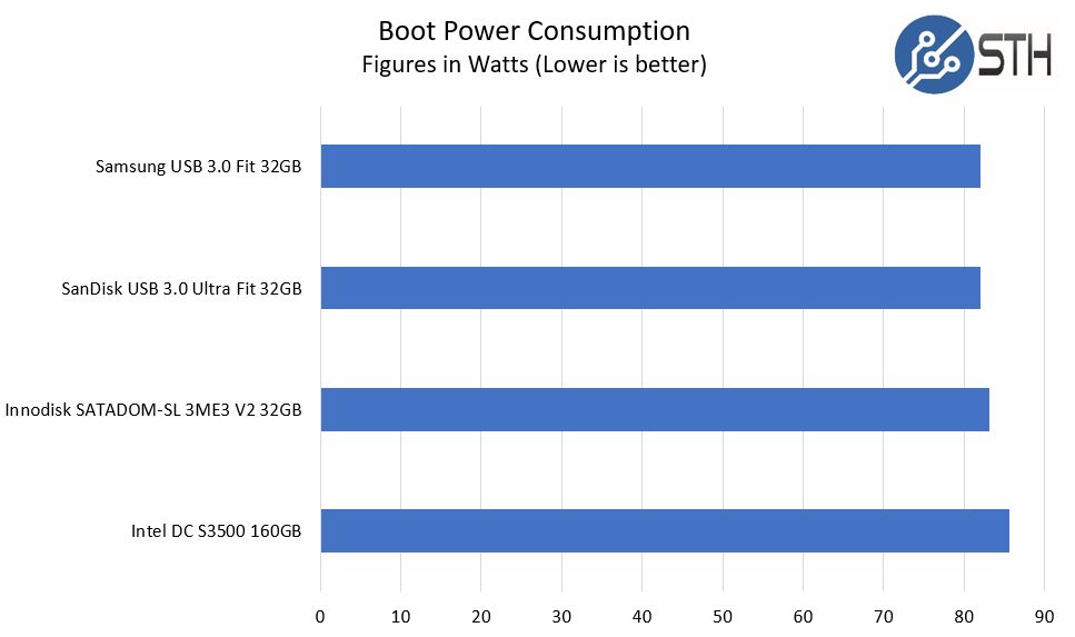 Booting to a USB flash drive has been an inexpensive way to get a flash boot device for years now. The advantages of using USB drives is that one can get an inexpensive drive that does not utilize a drive bay. Furthermore, one can boot a hypervisor OS while passing through an entire SAS/ SATA controller to a VM. While the original incarnations in the USB 2.0 era were slow, USB 3.0 drives are plenty fast. Unlike SAS and SATA SSDs, there is precious little information on USB drive speeds and power consumption for these scenarios.