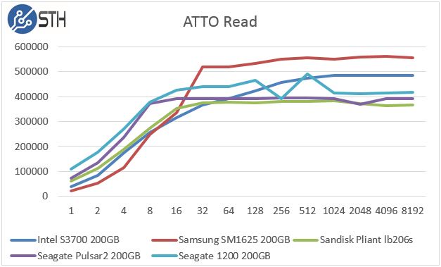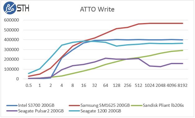 In terms of write performance v. transfer size we can see the Seagate 1200 200GB drive performance fairly well. In the larger size sequential tests the Samsung SM1625 200GB SAS2 drive is extremely strong in. On the other hand the Seagate dombinates other drives up to the 8k transfers. We can see that compared to the previous generation drive, Seagate had a massive generational performance improvement.