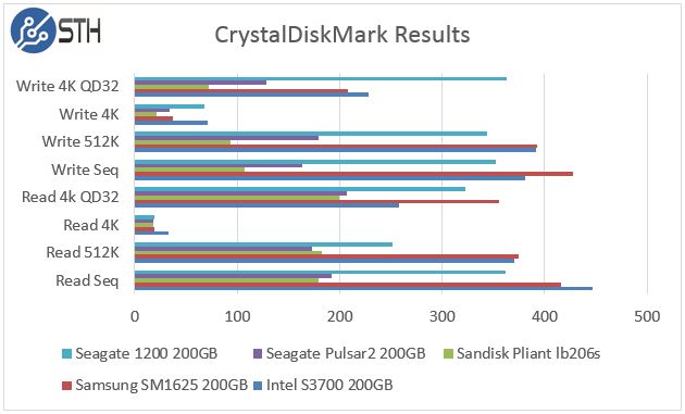 Here we see that the Seagate 1200 200GB drive performs well at the higher queue depth Write 4K QD32 test. In virtually every test it outperforms both the Seagate Pulsar.2 200GB as well as the SanDisk Lightning lb206s 200GB SLC drive.