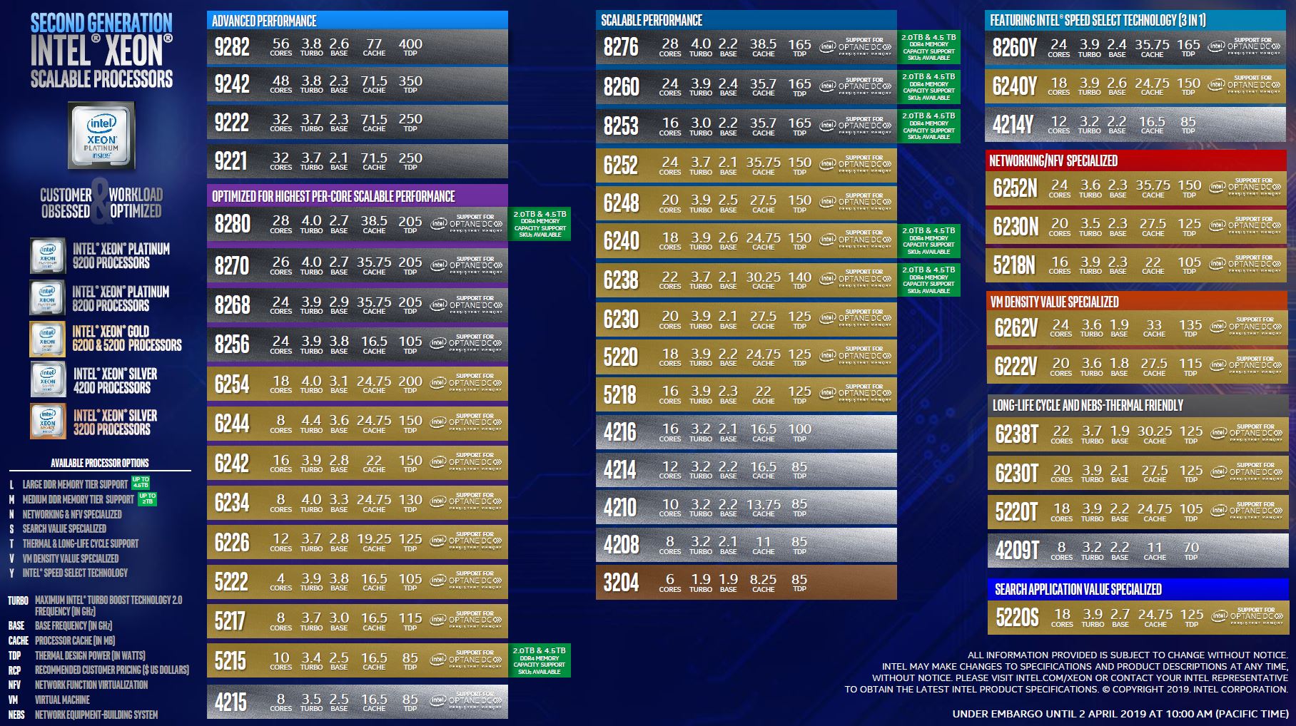 Second Generation Intel Xeon Scalable Processors SKU List 1
