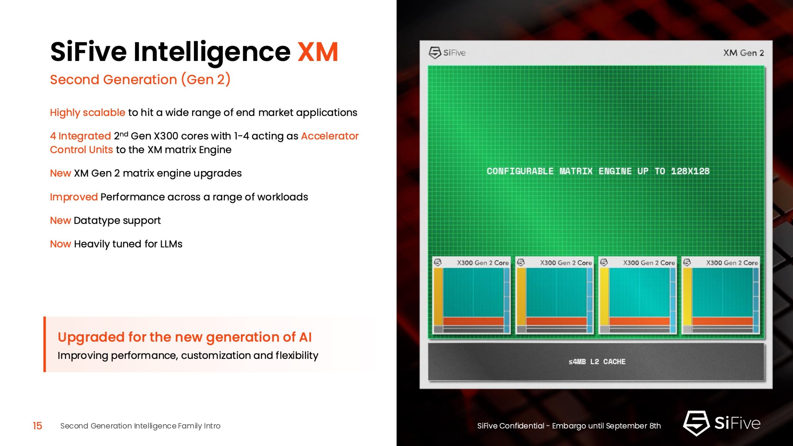 SiFive has IP for its 1st Gen Intelligence family that ranged from the X200 to XM series. This included things like the scalar compute cores, but also big vector and matrix engines. One can then use these designs in clusters to build bigger AI chips, or use standalone IP blocks to make lower power control nodes.