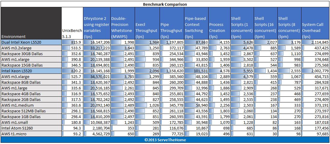 When it comes to multi-threaded UnixBench performance, the dual Intel Xeon L5520 and single CPU versions perform very well as compared to their cloud counterparts. The Amazon AWS EC2 instances and the Rackspace cloud instances are clearly struggling to keep up. Also interesting here is that the single Intel Xeon L5520 is significantly faster than this year’s Intel Atom S1260.