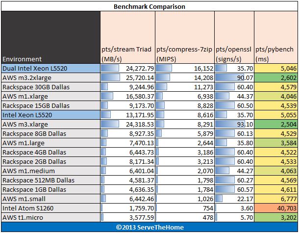 An interesting note here is that the Amazon AWS EC2 m3 instances were both based on Intel Xeon E5-2670 processors. In terms of raw memory bandwidth the shared cloud infrastructure allowed about the stream triad performance of the dual Intel Xeon L5520. The second generation EC2 m3 instances also did well in the openssl and pyBench tests.