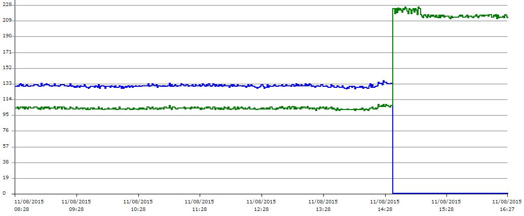 We looked back at the log files over the previous 8 hours this Sunday morning. We are logging a sample every minute so there are a total of 480 data points on this graph. During the last two hours we were finishing up installing a new OpenStack node and decided to use our Windows server as a test case. The second power supply was disengaged and removed from operation. Luckily the first power supply was able to handle the load easily and the machine continued operating in its normal state. Here is what the graph looks like: