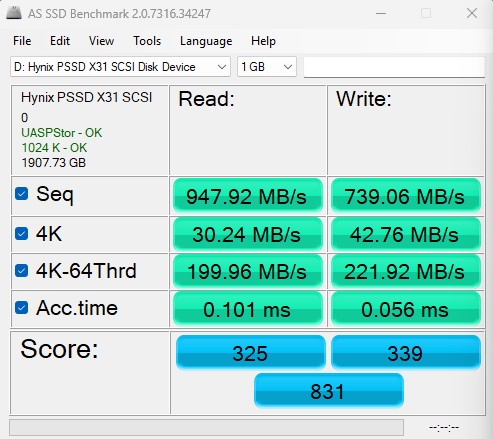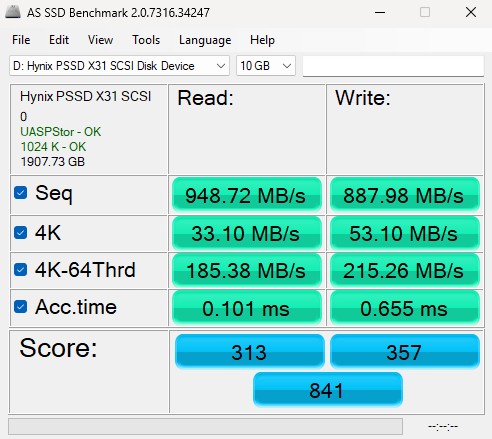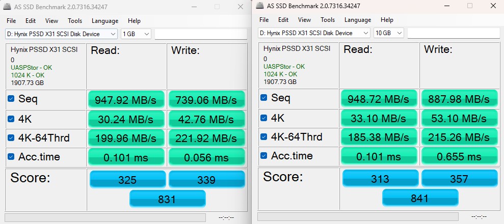 AS SSD Benchmark is another good benchmark for testing SSDs. We run all three tests for our series. Like other utilities, it was run with both the default 1GB as well as a larger 10GB test set.