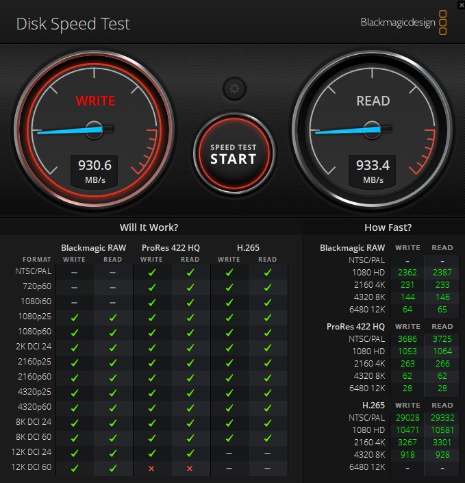 Here we can see the 12K DCI 60fps ProRes 422 HQ get the “red X” meaning that this drive is not fast enough for those formats. On the other hand, that is a very high-end format, so perhaps that is the point where it makes sense to get something faster.