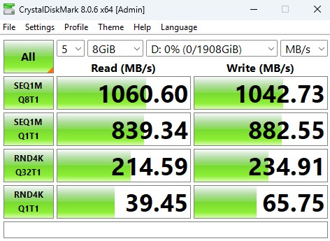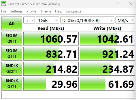 Something notable is that the drive tends to perform relatively similarly at the smaller and larger transfer sizes.