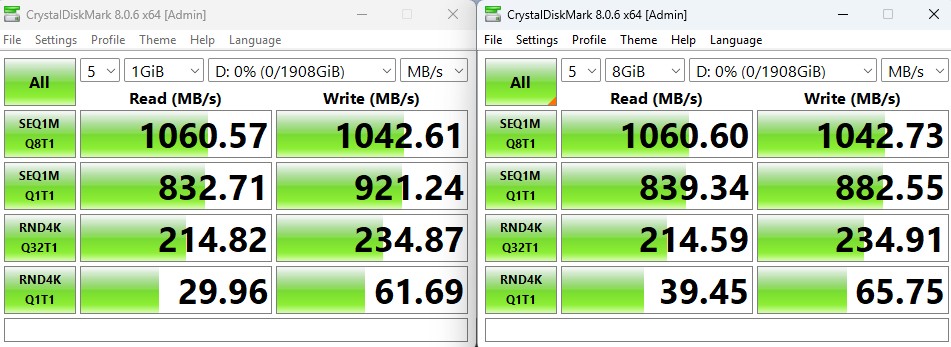 CrystalDiskMark is used as a basic starting point for benchmarks as it is something commonly run by end-users as a sanity check. We use both 1GB and 8GB test sizes.