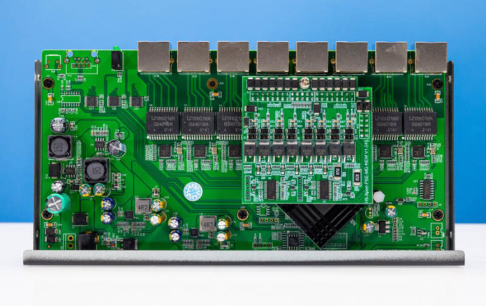 Inside the switch, we can see the ports on the front with the PoE indicator LEDs on the bottom of the PCB.