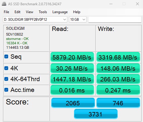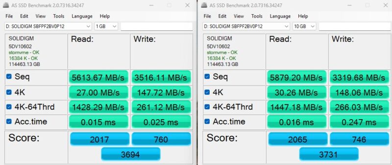 AS SSD Benchmark is another good benchmark for testing SSDs. We run all three tests for our series. Like other utilities, it was run with both the default 1GB as well as a larger 10GB test set.