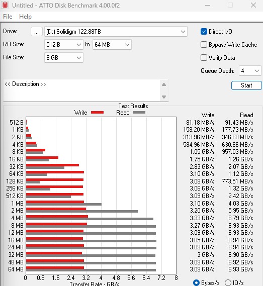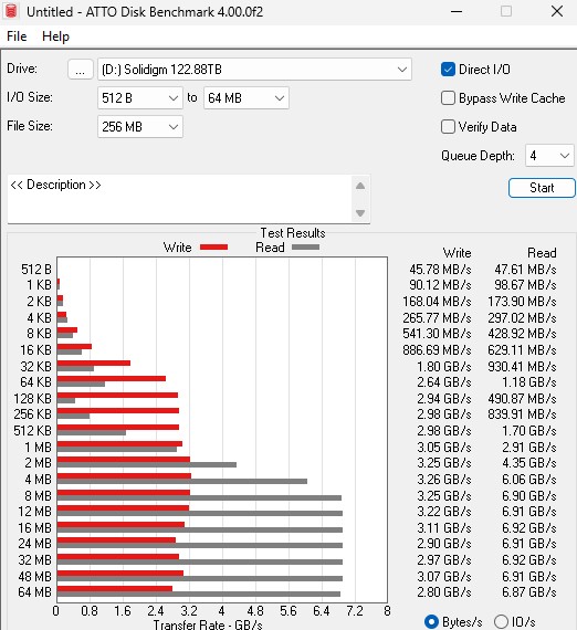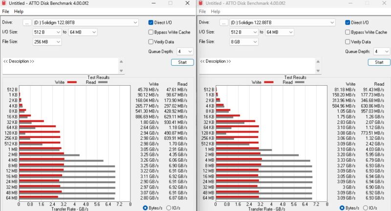 Here the ATTO results show that we have a PCIe Gen4 NVMe SSD that is closer to saturating the bus on the sequential read rather than sequential write side.
