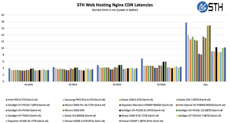 Moving to the file server and nginx CDN, we see much solid QoS and throughput from the Pascari SSD. The drive pulls ahead on the file server due to its faster sequential speeds. On the nginx CDN test, we are using an old snapshot and access patterns from the STH website, with caching disabled, to show what the performance looks like in that case. Here is a quick look at the distribution: