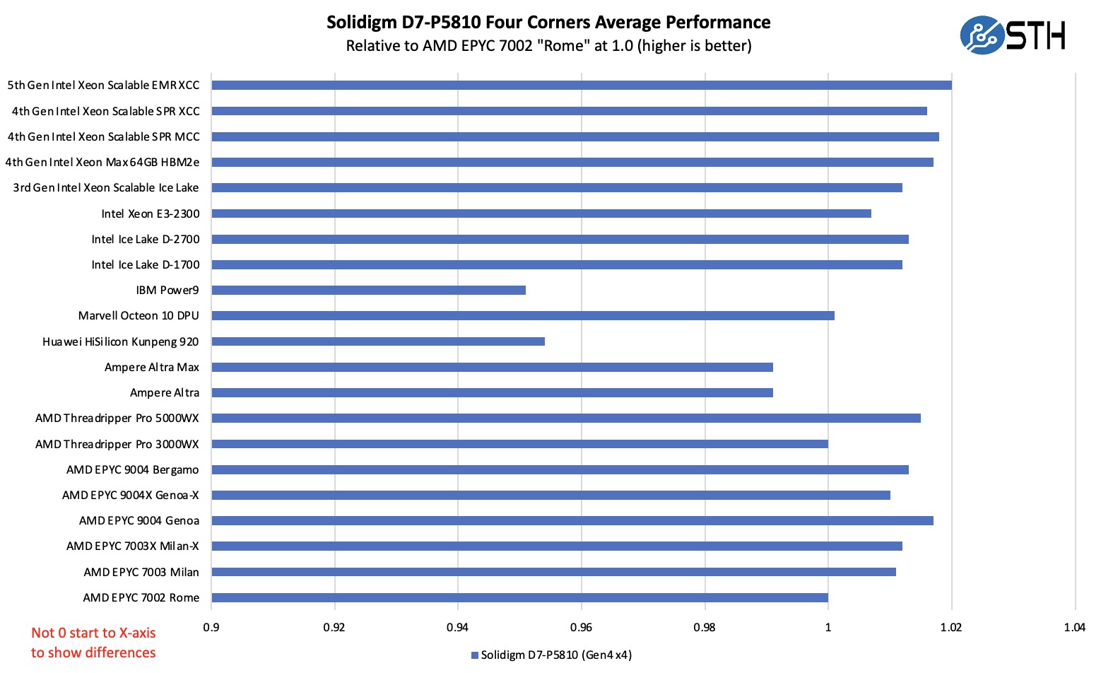 Solidigm D7 P5810 Four Corners Average Performance By CPU Zoomed