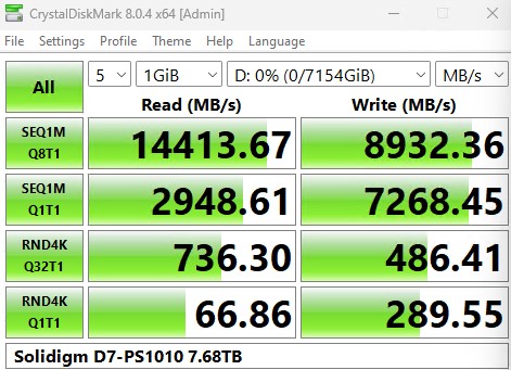 Solidigm D7 PS1010 7.68TB CrystalDiskMark 1GB