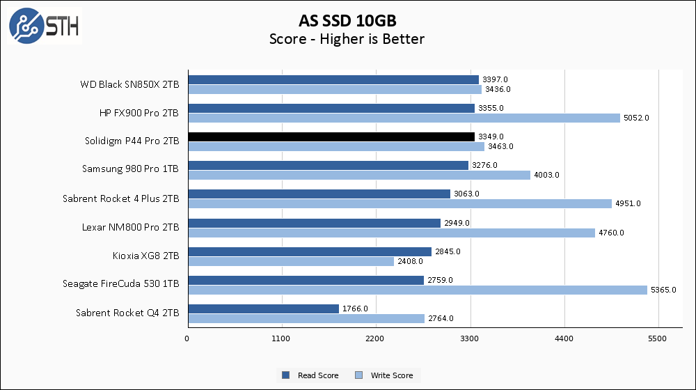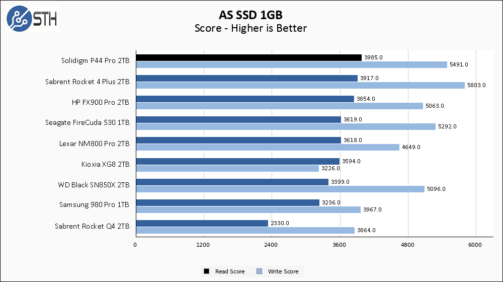 Since we sort our charts by read performance, up until now the P44 Pro has not actually been visually displayed at the top of a chart. AS SSD changes that, with the best read score I have yet seen by a 2TB drive. Write score is also very near to the best I have seen.