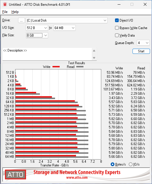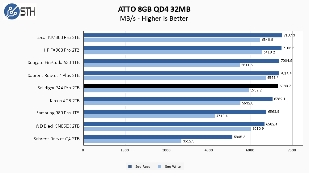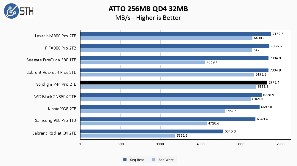 The P44 Pro does well ATTO, with results right in line with rated specs. In terms of the rest of the drives on my chart, the P44 Pro is the write speed leader.