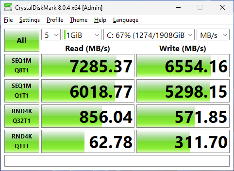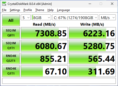 The Solidigm P44 Pro 2TB slightly overperforms compared to its rated specs in CrystalDiskMark. The advertising for the P44 Pro promises 7000 MB/s read and 6500 MB/s write, and the P44 Pro beats both of those specs by a moderate margin. In comparison to the other drives on my chart, the P44 Pro is a half-step behind the fastest drives in read speed, but is very close to the top write speeds.