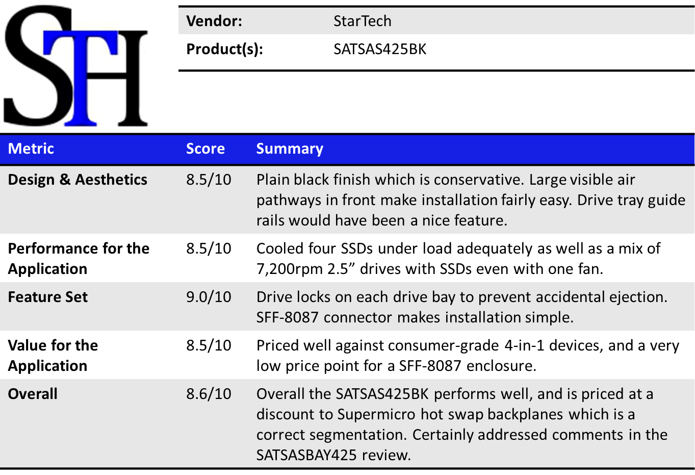 Having used both, I think the StarTech SATSASBAY425 is a great device, but I prefer the SATSAS425BK because it is much easier to use. First, drive installation requires four screws to attach to the no nonsense drive tray. Second, the single 4-pin Molex power connector and the single SFF-8087 data connector make installation very simple, especially since one can use a standard SFF-8087 to SFF-8087 cable commonly used with RAID controllers. Compared to individually wiring drives, whereas one would need to connect four power connectors and four 7-pin data connectors otherwise the SATSAS425BK requires only two. Third, adding the drive tray locking mechanisms helps secure drives from accidental disturbance when being transported to the data center and when drives need to be swapped. Having hot swap chassis in place of traditional 5.25″ optical media drives makes a lot of sense these days, and the StarTech SATSAS425BK is an excellent option for those looking with a retail price of around $70.
