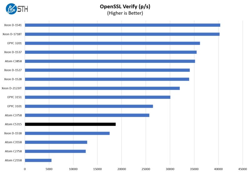 On platforms using the Atom C5315, many are likely to use the crypto offload of QAT. Still, we wanted to see the performance of OpenSSL without the accelerator here to compare it to a broad range of chips. Here we can see the part outpacing the Intel Xeon D-1518 and the Atom C3558 by solid margins.