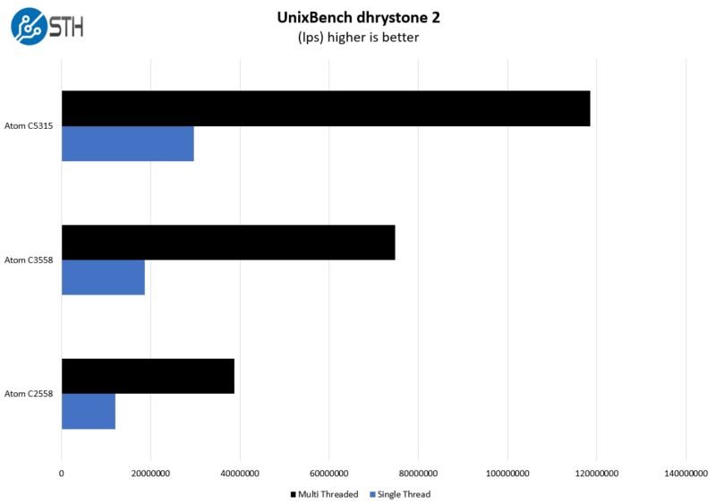 These are not benchmarks that we have used in a long time, but we recreated our old setup for the Atom C2558 era, and so we could compare data between three generations and a decade of 4-core embedded Atoms. Here are the dhrystone 2 results: