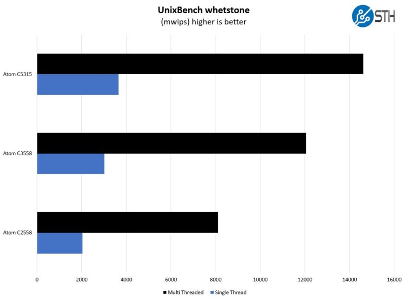 Looking back through generations, we can see that we are nearing around 2x the per-core performance of the Atom C2000 series and a fairly sizable ~30% increase generation on generation versus the C3000 series Atom parts. Even with the large caches, we are nowhere near the Intel Xeon D-1718T. There is a much larger gap here than we saw in some previous generations between lower-end Xeon D and Atom parts.
