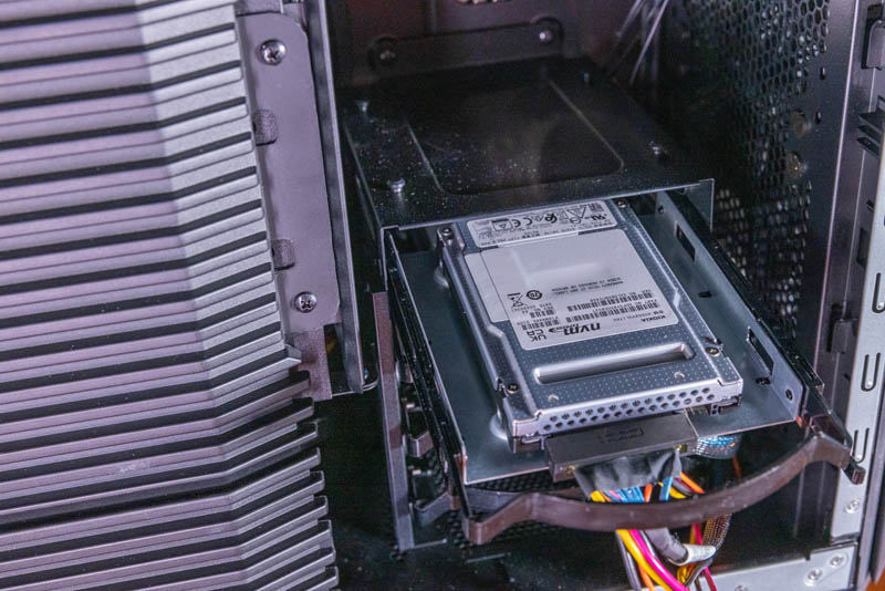 Under that right shroud, we have our 3.5″ storage bays. These 3.5″ bays can also house 2.5″ drives, even NVMe drives like the Kioxia CD6 drives we have here using mounting adapters. These are not hot-swap bays. That is pretty common in this class of workstation, especially as SSDs have become so much more reliable than their rotating predecessors.
