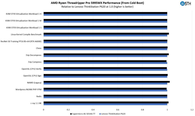 We also tested the solution against theĀ Lenovo ThinkStation P620 since that is an air-cooled solution. On the initial runs, before the machines warm up, they are very similar in terms of performance.