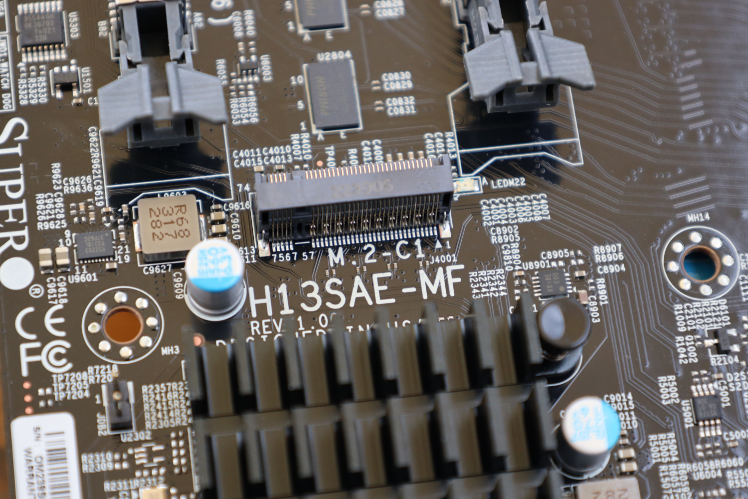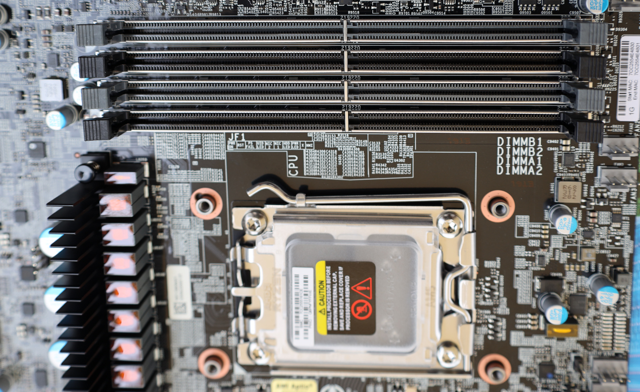 One thing you might immediately note as a contrast to a consumer desktop mATX AM5 motherboard is that the CPU socket and memory slots are rotated 90 degrees. This is done to align the H13SAE-MF for front-to-back airflow when installed in a rackmount server, and all of the heatsinks and components on this board are positioned to allow air to flow in that direction.