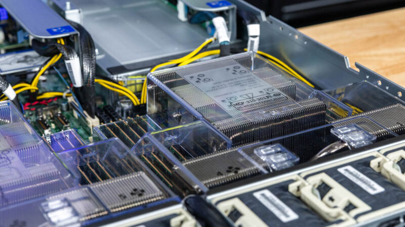 The heatsinks look extra cool. This server can handle up to 500W TDP CPUs, so we tend to see these heatpipe coolers in servers like this.