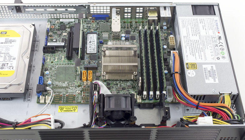 Inside the server we can see a Supermicro X10SDV FlexATX layout motherboard, the X10SDV-2C-TP4F. The motherboard features an onboard Intel Pentium D1508 which is a dual core, four thread processor. With 3MB L3 cache and a 2.2GHz base clock (2.6GHz turbo) the processor is essentially half of the Intel Xeon D-1518, yet with higher maximum clock speeds. Here is a link to the specs comparison via Intel ARK. The Intel Pentium D1508 is a 25W TDP CPU and that includes both the platform controller hub and 10GbE MAC on the SoC. Given the use of the Broadwell-DE platform, the system can handle up to four DDR4 RDIMMs for up to 128GB of 1866MHz RAM.