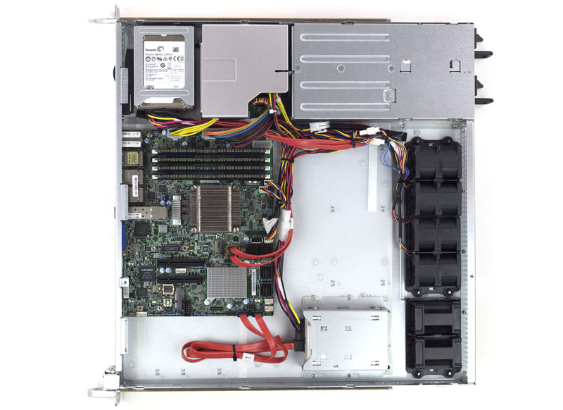Inside the system we see a redundant set of fans near the PSU bezel and a very small motherboard inside. One can see our two stacks of Seagate Enterprise Capacity V3 1TB 7200rpm drives as well. We removed the PCIe riser and the airflow shroud from this picture to show off the internals better: