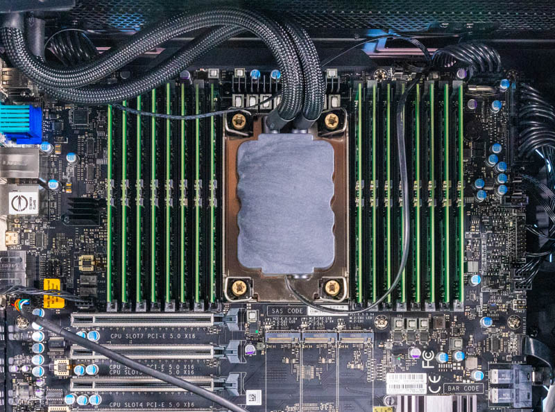 The other unique feature is the memory and memory orientation. In this system, the DDR5 memory is oriented in a vertical manner. This allows Supermicro to fit a full 16 DDR5 DIMM slots in the system. We have looked at several Xeon W-3400 systems already, and Supermicro’s competitors only have half of those slots at only 8 DIMM slots.