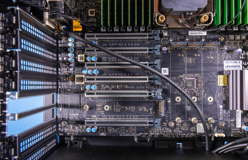 Beneath the giant block of CPU and memory, we get a healthy PCIe I/O subsystem with a neat trick. Here all six slots are PCIe Gen5 x16 slots which is great if you have a lot of devices you want to add.