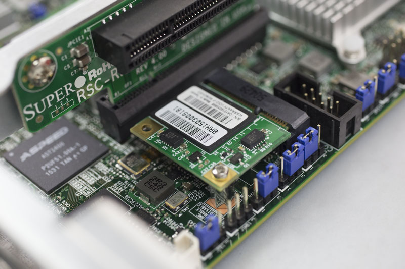 In addition to the standard PCIe slots, there is also a M.2 PCIe slot for storage. In this picture we have a Samsung SM951 512GB SSD installed in that slot. With M.2 SSDs being available for relatively low prices and with performance well above SATA SSDs, this is a welcome feature. We can also see the mPCIe slot (with mSATA support) on the motherboard. Here is what this looks like with a 64GB mSATA SSD meant for OS installations. Note that it is very low profile and one can use a 1U PCIe riser and still install components in this mPCIe slot.