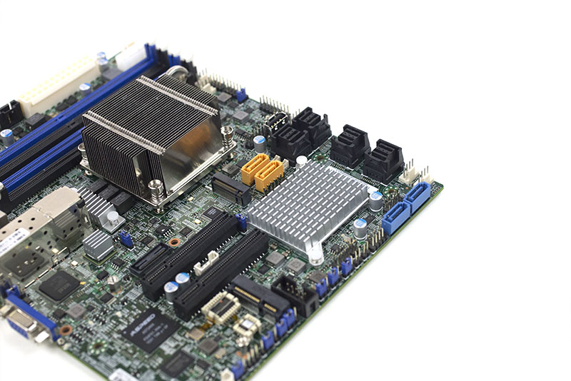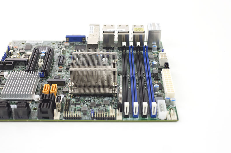 The Xeon D-1587 is a 65w TDP part, therefore Supermicro is using a taller, passive, 1U heatsink for this platform than we see on the 2 core to 8 core Xeon D platforms. Components including the CPU heatsink and the four DDR4 RDIMM slots (up to 128GB DDR4 RAM) are all oriented for standard server airflow. We even see the motherboard battery in a position to work with this ariflow.