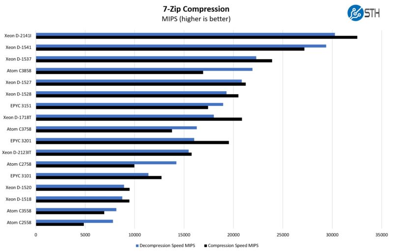 Again, we see very solid performance here. This is sorted by compression speed, but it is still very competitive with higher core count and TDP parts.